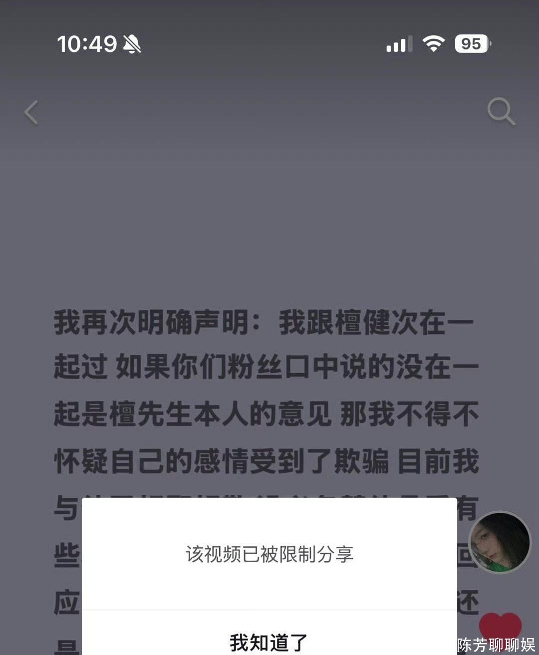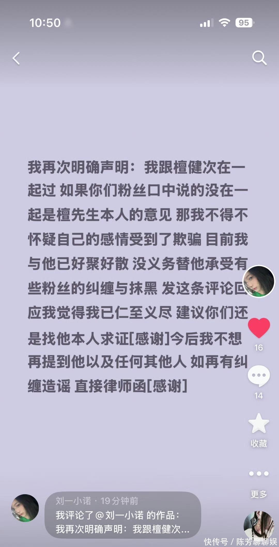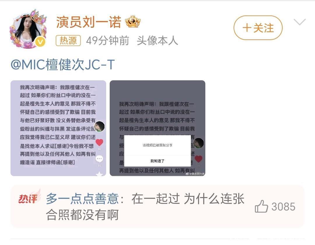 1月10日,刘一诺发文直接艾特檀健次,晒出了截图说两人之前在一起过,不过已经好聚好散了,刘一诺还表示没有必要承受檀健次粉丝的纠缠与抹黑,还说如果粉丝再有纠缠造谣,直接发律师函!P.s:他粉丝还一直刺激她,之前檀粉丝说女方不敢安特本人,因为只要她带檀健次大名,檀健次工作室就告她了,结果这次女生直接安特檀健次本人了,打脸不?粉丝还是不死心,相信自家哥哥是36岁的纯情大男孩,一直在女方微博评论区说真在一起为什么连一张合影都没有粉丝不如装哑巴我说真的,本来没声音了又让人家出来说话!万一真把合照视频放出来,粉丝心脏受不了有网友的嘴真损啊,粉丝都在那说放合照才相信她!结果网友说:双方存在身高差,无法拍到面部的同框照看了一圈评论区, 他的粉丝不看到合照不善罢甘休!求锤得锤,爆合照吧!假的话支持檀健次工作室直接发她大名告她!你们站谁?#檀健次##刘一诺#